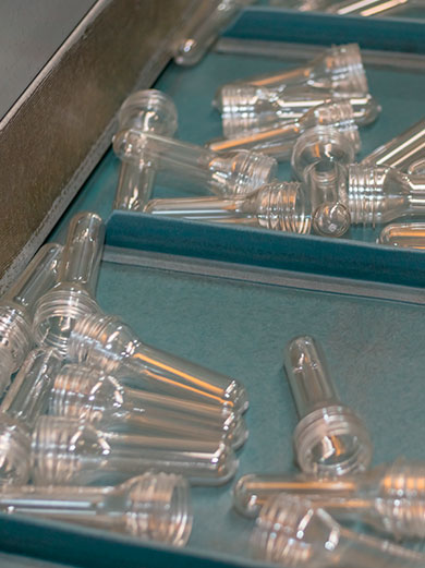 Мы производим преформы посредством плавки основного материала – полиэтилентерефталата. После расплавления сырье подается в термопластавтоматы (ТПА) для литья под давлением. При производстве расплавленный полимер под давлением заливается в закрытую охлаждаемую горячеканальную форму, которая по конфигурации идентична изготавливаемой продукции. Расплавленный полимер застывает, после чего форма открывается и готовые изделия пересыпаются на транспортер. Далее они отправляются в приемный короб.